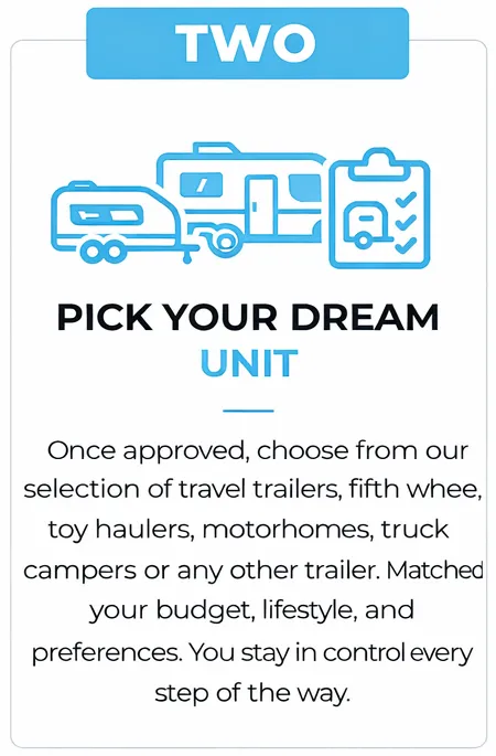 Fast approvals, flexible financing, and units that match your needs. Whether your credit is great, new, or challenged, we’ll help you finance your trailer with confidence.